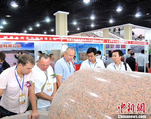 9月4日,第一届中亚·新疆石材博览会在新疆鄯善中亚石材博览中心(新疆石材博物馆)盛大开幕了。据统计疆内外石材产地的企业、客商及中亚地区客商、企业代表近200人参加了石材博览会。截至目前,博览会已经初步达成合作意向并签约达项目36个,其中2项合作协议、4项重点签约项目约5亿元、30项石材购销合同约1.6亿元。图为,来自中亚的客商聆听讲解员介绍中国新疆石材市场需求情况。