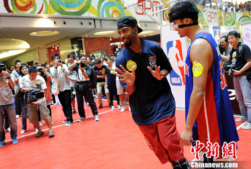 9月4日,美国NBA球星、底特律活塞队后卫汉密尔顿,4日在香港一商场为少年传授篮球技术。