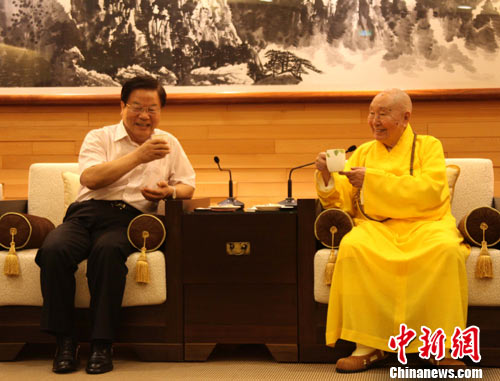 中华文化联谊会名誉会长蔡武一行9月4日下午拜访中台禅寺,与中台禅寺住持惟觉大和尚茶叙。蔡武与惟觉畅谈中华文化发展传承,希望两岸能够更加积极推动文化交流,丰富民众精神生活。