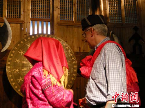9月4日,联合国世界旅游组织执行主任马修·法维拉在桂林龙胜的黄洛瑶寨扮演新郎“迎娶”瑶家阿妹。当天,参加第四届联合国世界旅游组织/亚太旅游协会旅游趋势与展望国际论坛的嘉宾对桂林龙胜的黄洛瑶寨、平安壮寨和龙脊梯田景区进行了技术考察。