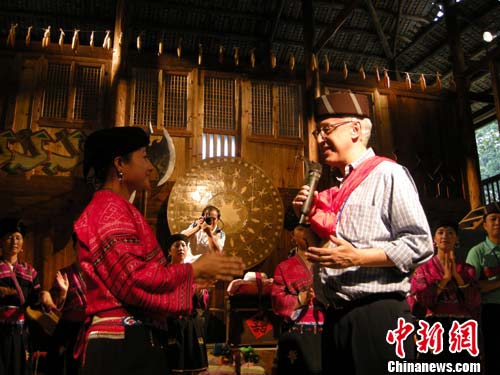 9月4日,联合国世界旅游组织执行主任马修·法维拉先生在桂林龙胜的黄洛瑶寨与瑶家阿妹唱情歌。中新社发 赵琳露 摄
