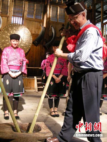 9月4日,联合国世界旅游组织执行主任马修·法维拉在桂林龙胜的黄洛瑶寨体验瑶族舂米生产习俗。中新社发 赵琳露 摄