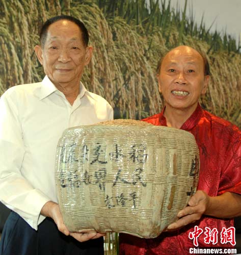 9月5日,“铜官窑惟一传人”胡武强老艺人把他创作的陶艺作品“丰收箩”赠送给“杂交水稻之父”袁隆平,祝贺袁院士八十大寿。这件惟妙惟肖的“丰收箩”与农家装谷物的竹篾箩筐大小、颜色都十分逼真,编织的根根竹篾以及筐内粒粒饱满的稻谷都十分地精细;作品上还烧制了袁隆平院士亲手题字的“发展杂家水稻,造福世界人民”字样,以及有胡武强的贺词“敬赠‘米神’袁隆平先生”。图为袁隆平和胡武强合影留念。