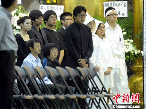 5日,马尼拉人质事件中殉职的香港领队谢廷骏在红磡世界殡仪馆设灵,下午2时半至6时半公祭。图为谢廷骏的父母及亲人在灵堂上。