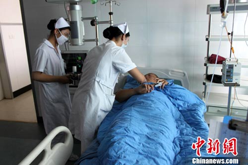 由中国地震局地质研究所和新疆地震局共同组成的一支30人科考队,因运送给养车辆出现故障,3日晚间被困于新疆南部昆仑山区,并有3名队员出现高原反应。5日上午9时07分,新疆军区某陆航旅一架直升机从和田机场紧急起飞,前往昆仑山区实施营救。并于10时与被困人员会合,3名出现严重高原反应人员已经搭乘救援直升飞机飞往和田进行救治。图为和田地区人民医院医护人员正在对出现高原反应的新疆电视台记者做检查。
