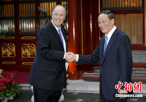 9月6日,中国国务院副总理王岐山在北京钓鱼台国宾馆会见了美国总统国家安全事务副助理多尼隆、白宫国家经济委员会主任萨默斯。中新社记者 廖攀 摄