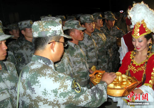 当地时间9月7日凌晨,中国人民解放军参加“和平使命-2010”上海合作组织联合反恐军事演习陆军战斗群第一列车梯队参演官兵及装备,顺利抵达临近演习现地的哈萨克斯坦奥塔尔市火车站。中新社记者 孙自法摄