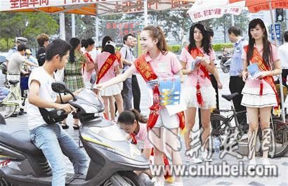 “您好,请走斑马线过马路。”“对不起,电动车不允许带人,请遵守交通规则,尊重生命。”昨日(6日)下午,在汉口建设大道新华路路口,26位“湖北小姐”参与本报与武汉市交管局、湖北小姐大赛组委会共同主办的“美丽斑马线”活动,她们用谦和的微笑、轻柔的语言,劝导市民遵守交通规则,文明过马路。(郑晶晶 黄进明 黄飞 张振宇)