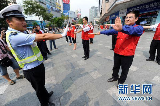 9月7日,江苏黄埔再生资源利用有限公司董事长陈光标向交警学习交通指挥手势。韩瑜庆 摄