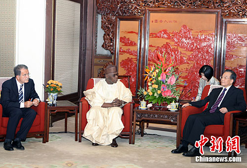 9月7日下午,中国国务院总理温家宝在北京中南海紫光阁会见来华出席“21世纪论坛”的外国政要,包括尼日利亚前总统奥巴桑乔(左二)、欧盟委员会前主席普罗迪(左一)、澳大利亚前总理霍华德、俄罗斯前总理普利马科夫、德国前总理施罗德、日本前首相福田康夫。中新社记者 任晨鸣 摄