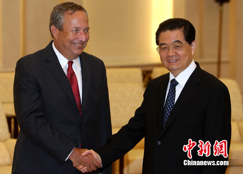 9月8日上午,中国国家主席胡锦涛在北京人民大会堂会见美国白宫国家经济委员会主任萨默斯。