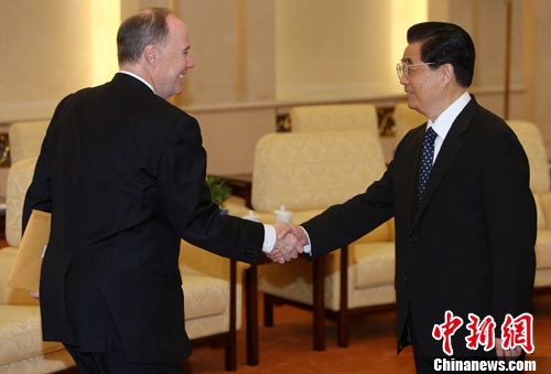 9月8日上午,中国国家主席胡锦涛在北京人民大会堂会见美国总统国家安全事务副助理多尼隆。中新社记者 任晨鸣 摄
