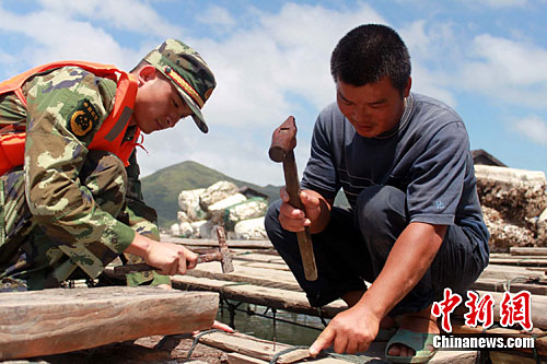 9月8日,福建省平潭县苏澳边防派出所组织民警深入辖区帮助群众解决困难,全力应对今年第10号热带风暴的袭来。图为边防官兵登上渔排帮助海上养殖户加固渔排。中新社发 黄煜情 摄