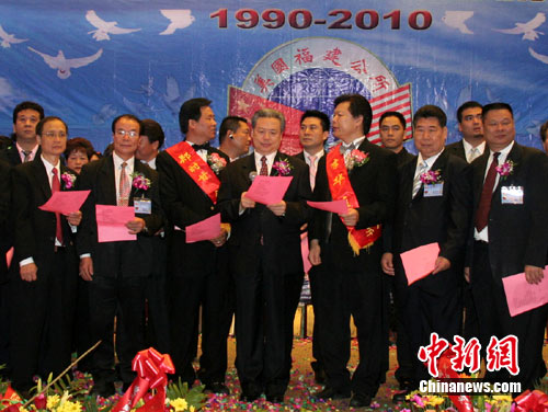 美国当地时间9月8日晚,纽约著名华人华侨社团美国福建公所举行隆重仪式庆祝成立20周年,新当选的两位联合主席李华(前右三)、郑时甘(前左三)当晚也正式在中国驻纽约总领事彭克玉(中)见证下宣誓就职,并表示将继续发扬美国福建公所多年来为华人华侨服务的传统,为提高在美华人华侨的凝聚力和影响力而努力。