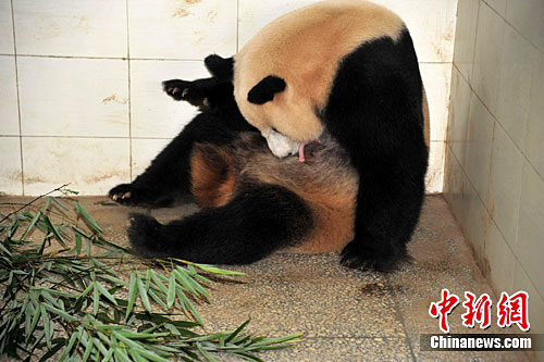 9月9日,记者从卧龙中国保护大熊猫研究中心获悉,当天清晨6时41分,卧龙大熊猫“晔晔”顺利诞下1仔,经专家鉴定,幼仔系雌性,出生体重179.6g,各项生理指标正常,目前“晔晔”带仔良好,幼仔已经吮吸到了初乳。中新社发 衡毅 摄