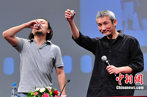 华语大片革命之作《狄仁杰之通天帝国》结束威尼斯之行后,9月9日导演徐克现身北京电影学院,参加第一期“新讲堂”为近千名学生开讲授课。谈及武侠片,徐克导演现场比划起宝剑,聊得兴起时请大学生上台共饮白酒,一起“煮酒论英雄”,还在现场公布自己的邮箱广征人才。谈及即将公映的多部电影,徐克坦言自己期待看到十一档的所有大片。中新社记者 李学仕 摄