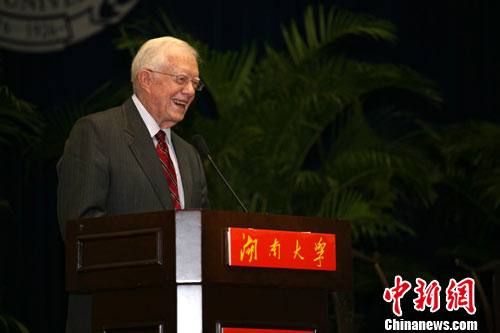 9月9日,美国前总统吉米·卡特在有着“千年学府,百年名校”之誉的湖南大学发表演讲,他表示希望中美人民尤其是青年进一步加强交流与了解。中新社记者 白祖偕 摄