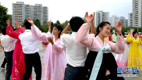 9月9日,朝鲜青年学生在首都平壤举行集体舞会欢度国庆。