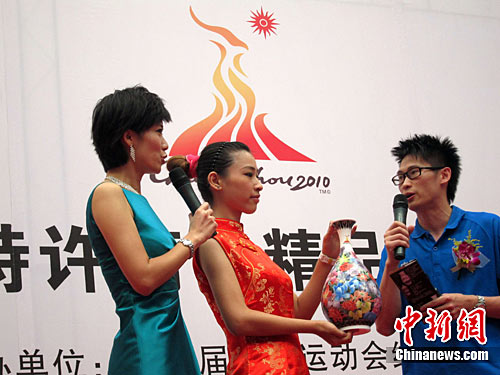 9月10日上午,广州亚运会特许商品精品展示暨新品发布会在活力天地广场举行,奥运冠军杨景辉在发布会上获赠特许商品“亚运之花”。中新社记者 柯小军 摄