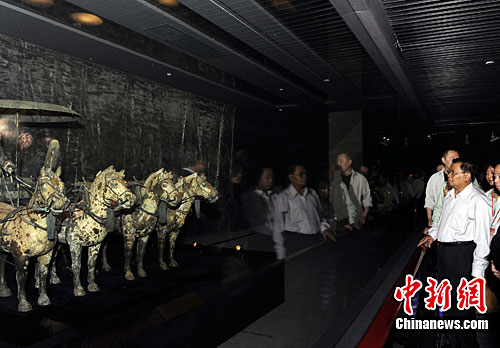 9月10日,正在上海访问的缅甸国家和平与发展委员会主席丹瑞来到世博园中国馆参观。图为丹瑞在中国馆内秦始皇陵铜车马前驻足观看。中新社记者 刘震 摄