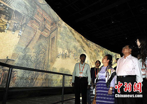 9月10日,正在上海访问的缅甸国家和平与发展委员会主席丹瑞来到世博园中国馆参观。图为丹瑞和夫人杜杰杰被中国馆栩栩如生的《清明上河图》长卷所吸引。中新社记者 刘震 摄