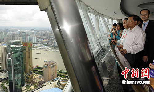 9月10日,缅甸国家和平与发展委员会主席丹瑞在上海访问。图为丹瑞登上东方明珠塔浏览上海风光。中新社记者 刘震 摄