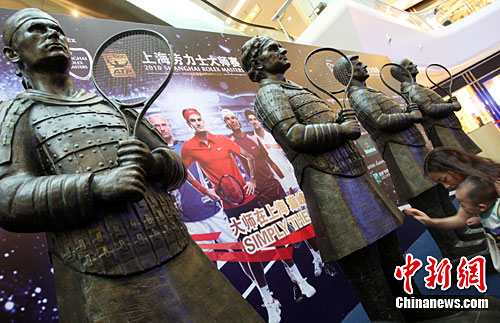 9月10日,广受瞩目的网球大师兵马俑雕像在上海正式“出土”,费德勒、休伊特、纳尔班迪安、德约科维奇和达维登科五座大师兵马俑栩栩如生,吸引了不少路人的目光。据悉,上海网球大师赛期间,这些兵马俑将正式进驻旗忠网球中心冠军大道,作为上海大师赛的永久标志。中新社记者 汤彦俊 摄
