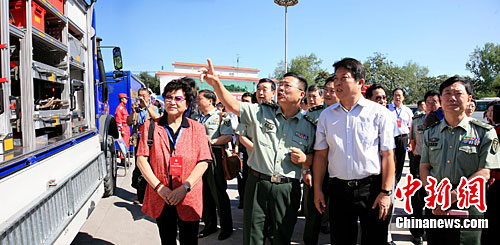 艺术家们兴致勃勃观看了救援队救援装。王保胜 摄