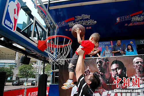 以“篮行天下,随星所悦”为主题匹克NBA篮球大篷车抵达桂林,9月11日在桂林市体育中心五环广场开启它第十站并与桂林球迷开展为期两天互动活动。图为小球迷也来过-把扣篮瘾。中新社发 唐梦宪 摄