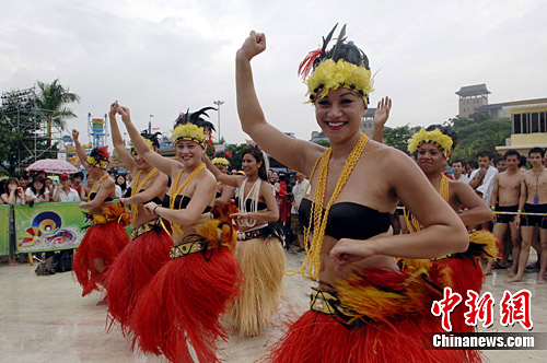 9月12日,夏威夷沙滩派对在广州长隆水上乐园盛大举行。来自美国夏威夷的专业草裙舞演员在欢快的节奏下翩翩起舞,为游客演绎了原汁原味的夏威夷风情草裙舞。刘卫勇 摄