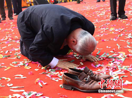 图为姜太公诞辰3149周年祭礼上韩国晋州姜氏中央宗亲会总会副会长姜锡星行跪拜大礼。 杨东亮 摄