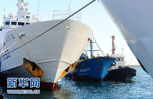 9月12日,日本海上保安厅的巡逻船将中国渔船拖回冲绳县石垣港。季春鹏 摄