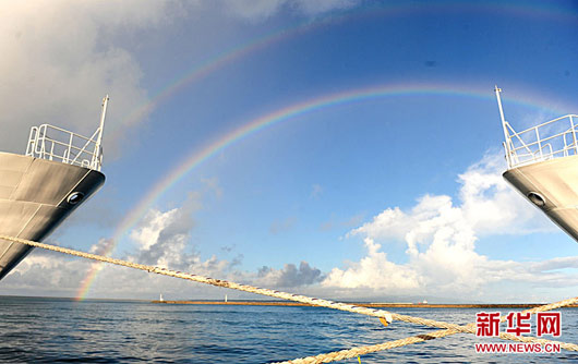 9月13日,在日本冲绳县石垣港停靠的我国渔船不远处天际出现彩虹。被日方扣押的我国渔船上的14名船员将于当日回国。 季春鹏 摄