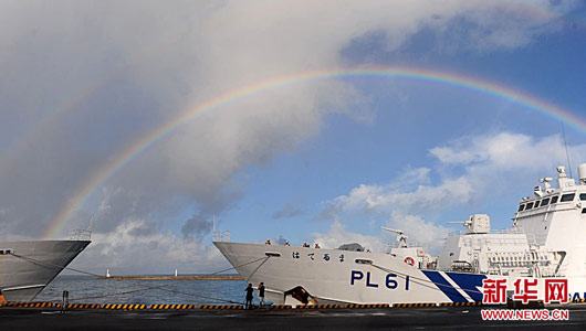 9月13日,在日本冲绳县石垣港停靠的我国渔船不远处天际出现彩虹。被日方扣押的我国渔船上的14名船员将于当日回国。 季春鹏 摄