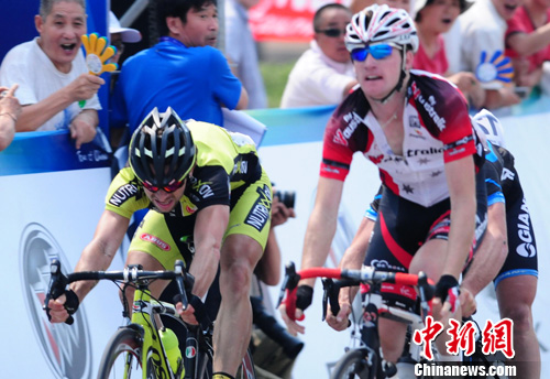9月13日下午,首届环中国国际公路自行车赛全程142.7公里的第三赛段在洛阳结束,图为各路选手冲刺终点。