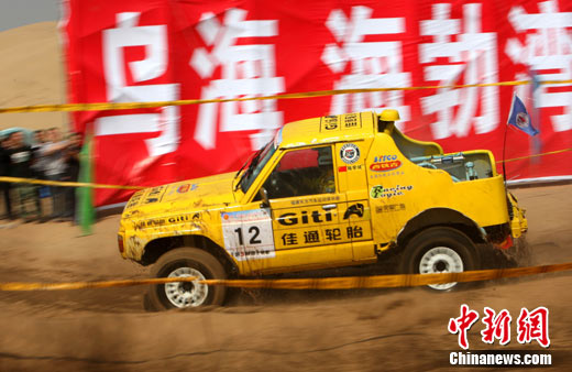 9月13日,由中国汽车运动联合会、内蒙古自治区体育局、乌海市委、市政府主办的2010“友谊精煤-德晟焦化杯”内蒙古乌海全国汽车场地越野锦标赛在金沙湾旅游区结束了三天的鏖战。图为选手在比赛中。 中新社记者 赵振清 摄
