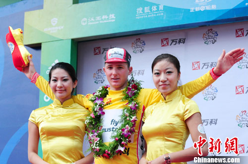 9月14日下午,首届环中国国际公路自行车赛第四赛段比赛在郑州结束,澳大利亚弗莱尔车队车手大卫・特纳(中)总成绩超过德国纽特里什车队车手德克・穆勒,成功夺得黄色领骑衫。