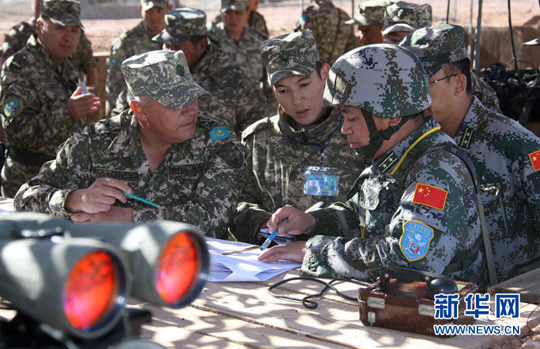 9月14日,在哈萨克斯坦马特布拉克训练场,实兵合练指挥所的中国军官和哈萨克斯坦军官在推演合练计划。王建民 摄