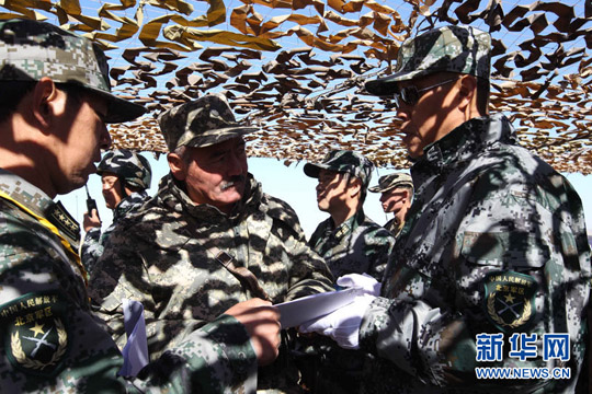 9月14日,在哈萨克斯坦马特布拉克训练场,实兵合练指挥所的军官在协商联合作战问题。王建民 摄
