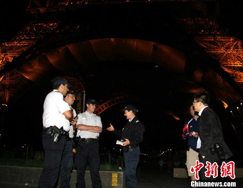 巴黎埃菲尔铁塔14日晚遭匿名电话声称“有炸弹”的威胁。法国军方和警方派出150余人前往现场排险,并疏散2500多人。经3个多小时搜索,一无所获,证明是“诈弹”惊魂。图为警方在现场交流搜索情况。中新社发 吴卫中 摄