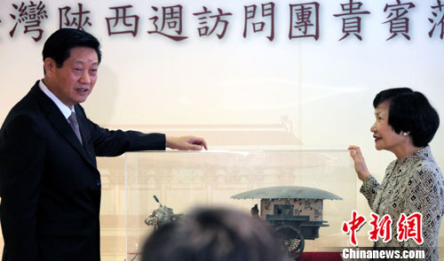9月15日,正率团在台北出席2010台湾陕西周活动的陕西省代省长赵正永,与台北故宫博物院院长周功鑫达成共识,双方将就文物交流展开实质性合作。图为赵正永向台北故宫赠送“秦始皇陵2号铜车马”复制品。中新社记者 刘舒凌 摄
