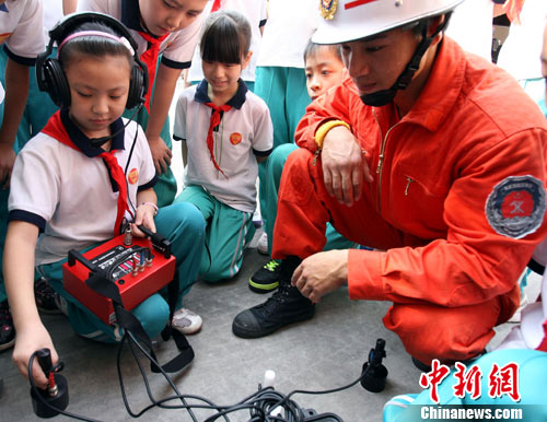 9月14日,北京警方与前门小学的学生代表共同近距离的体验消防战士的工作和训练情况,消防战士向同学们讲解并演示了生命探测仪、呼吸器等最新的消防装备的使用方法。