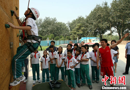 9月14日,北京警方与前门小学的学生代表共同近距离的体验消防战士的工作和训练情况,消防战士向同学们讲解并演示了生命探测仪、呼吸器等最新的消防装备的使用方法。图为北京小学生向消防叔叔学攀岩技术。