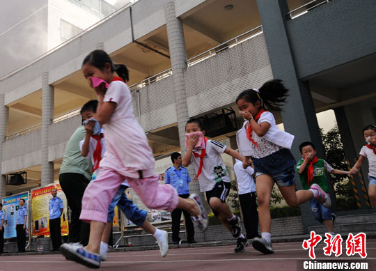 9月15日,重庆市公安局组织消防、刑警、治安、户政、出入境、交巡警6大警种,在重庆沙坪坝区树人凤天小学举办以“安全进校园”为主题的大型法律宣传活动,并组织学生进行校园火灾疏散演练。中新社记者 郭晋嘉 摄