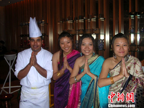 9月15日,来自新德里的印度大厨Sunil Dutt在桂林香格里拉大酒店为中外游客带来了最正宗的印度美食,深受广大游客喜爱。据悉,此次印度美食节将持续至9月26日。图为印度厨师和服务员笑迎中外游客。