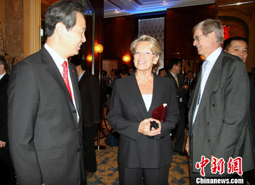 中国驻法国大使馆15日晚在巴黎举行盛大招待会,庆祝中华人民共和国成立61周年。法国政要名流、各界人士及旅法华侨华人等1000多人应邀出席,他们对新中国61华诞表达美好祝愿。图为法国国务部长兼司法部长米谢勒·阿利奥-马里(中)和中国驻法大使孔泉(左)在招待会上。