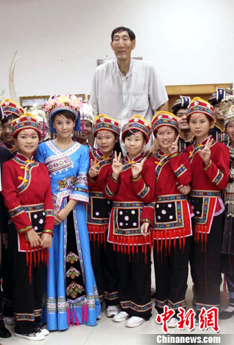 9月15日,身高2.36米、曾入选吉尼斯“世界第一高人”的内蒙古人鲍喜顺应邀来到广西罗城仫佬族自治县,为9月16日开幕的2010广西罗城攀岩旅游节系列活动助兴。