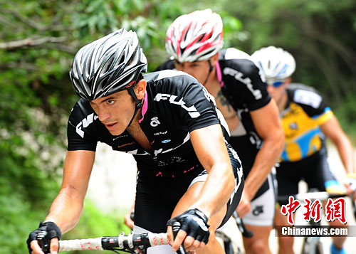 9月16日上午,首届环中国国际公路自行车赛第五赛段在山东省泰安市举行。本赛段最后10公里比赛路线设在东岳泰山的盘山路上,图为选手们在冲刺前奋力骑行。中新社记者 侯宇 摄