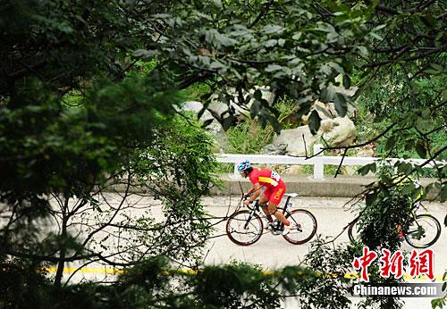 9月16日上午,首届环中国国际公路自行车赛第五赛段在山东省泰安市举行。本赛段最后的爬坡阶段设在泰山的盘山公路上,这是中国选手姜坤(红衫者)在比赛中,最终他获得本赛段的“大中华精英”奖。中新社记者 侯宇 摄