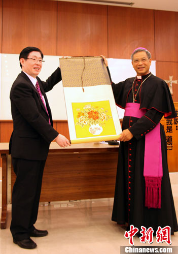 9月16日,中华宗教文化交流协会负责人、国家宗教事务局局长王作安(左)率大陆宗教交流团一行在台北拜会天主教台北总主教洪山川。图为王作安向洪山川总主教致赠一幅南京云锦。中新社发 刘舒凌 摄